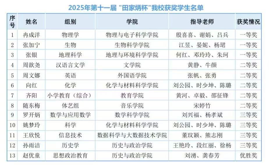 2025年11月28日至11月30日,第十一届“田家炳杯”全国师范院校师范生教学技能竞赛在浙江师范大学举行。该竞赛是由田家炳基金会冠名赞助、浙江师范大学承办,目前国内规模最大、学科最全、影响最广的师范生教学技能赛事,共有来自全国289所高校的2345名选手参加。经过激烈初赛,178所院校的561名选手成功进入决赛。我院时少坤、刘公园、陈璐三位老师指导2022级化学班向红和姚梦玲两位同学,分别斩获化学组二等奖和科学组三等奖,取得较优异成绩,彰显了学院教育教学创新和全面提升师范人才培养质量的成效。