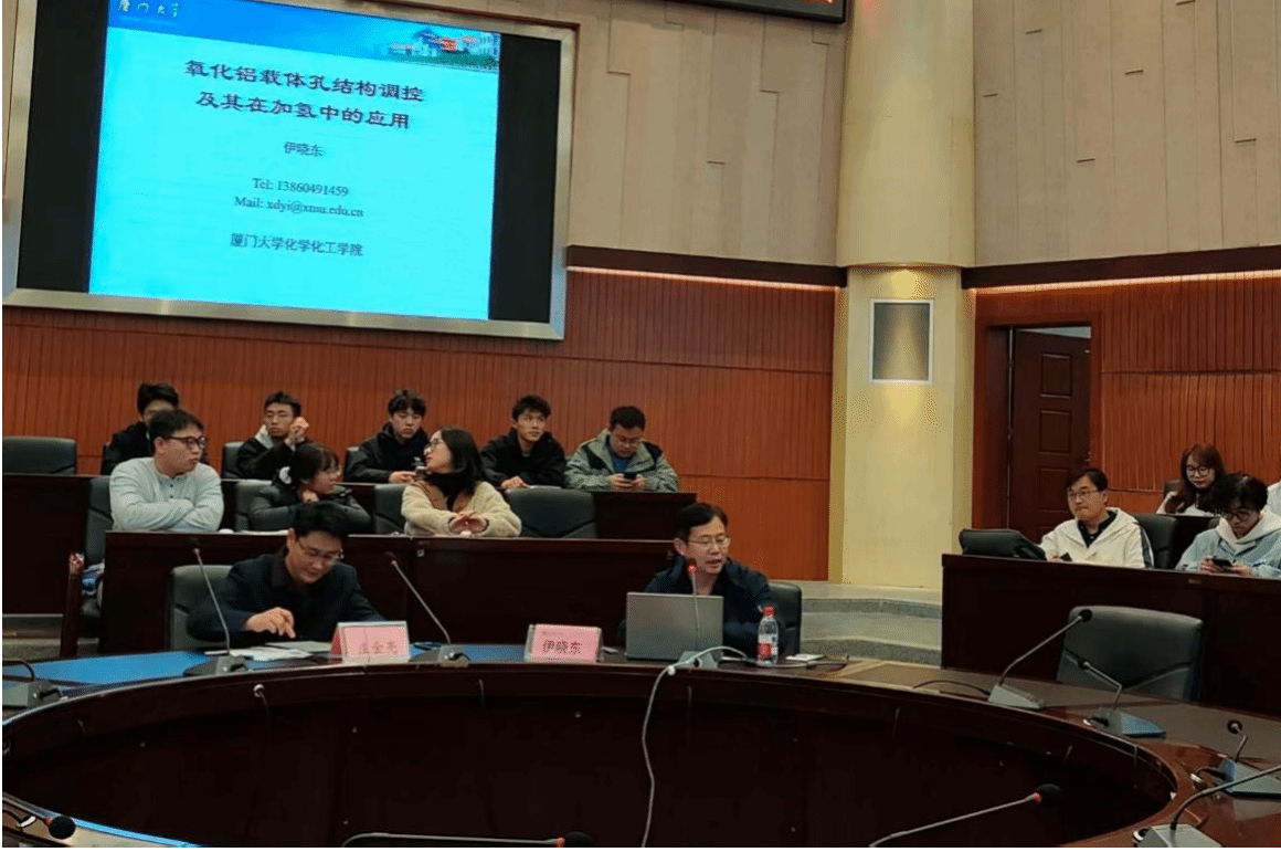 同日下午,伊晓东教授在东校区会议中心圆厅作题为《氧化铝载体孔结构调控及其在加氢反应中的应用》的学术报告,现场座无虚席。报告聚焦载体微结构设计与催化性能调控,分享最新研究进展,并与我院师生深入交流,为进一步拓展科研合作奠定良好基础。
