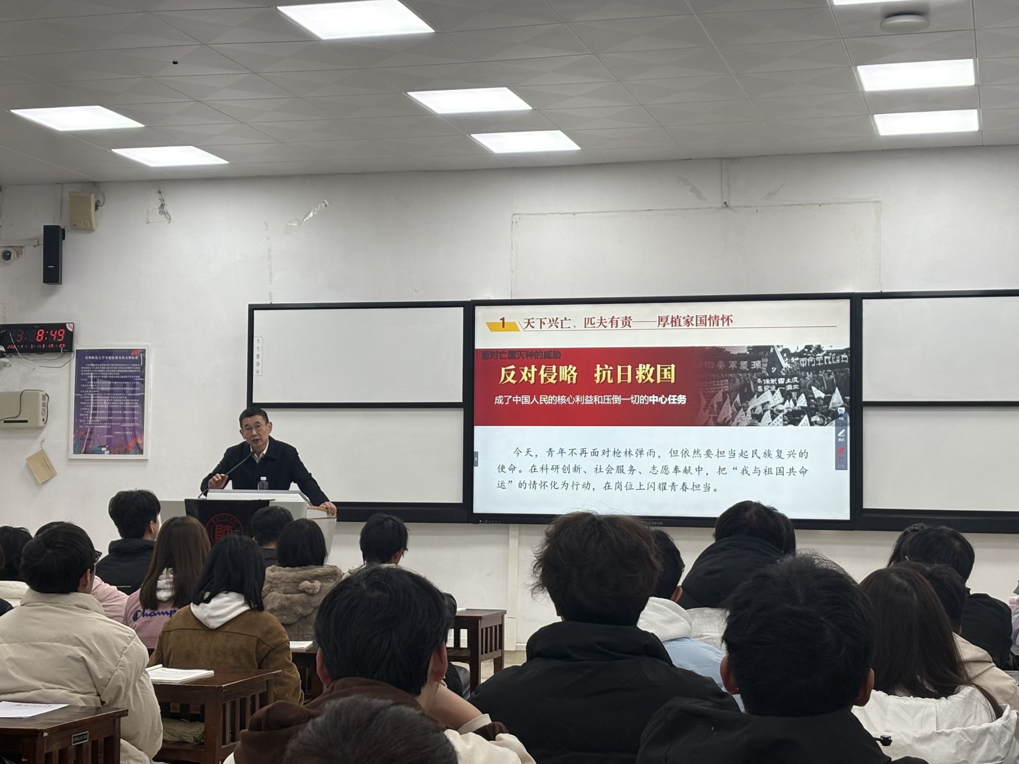 2025年12月2日,张绍东校长深入思政课堂,围绕“中国人民抗日战争”为主题,为化学与材料科学学院2024级应用化学、材料化学班同学讲授《形势与政策》课。