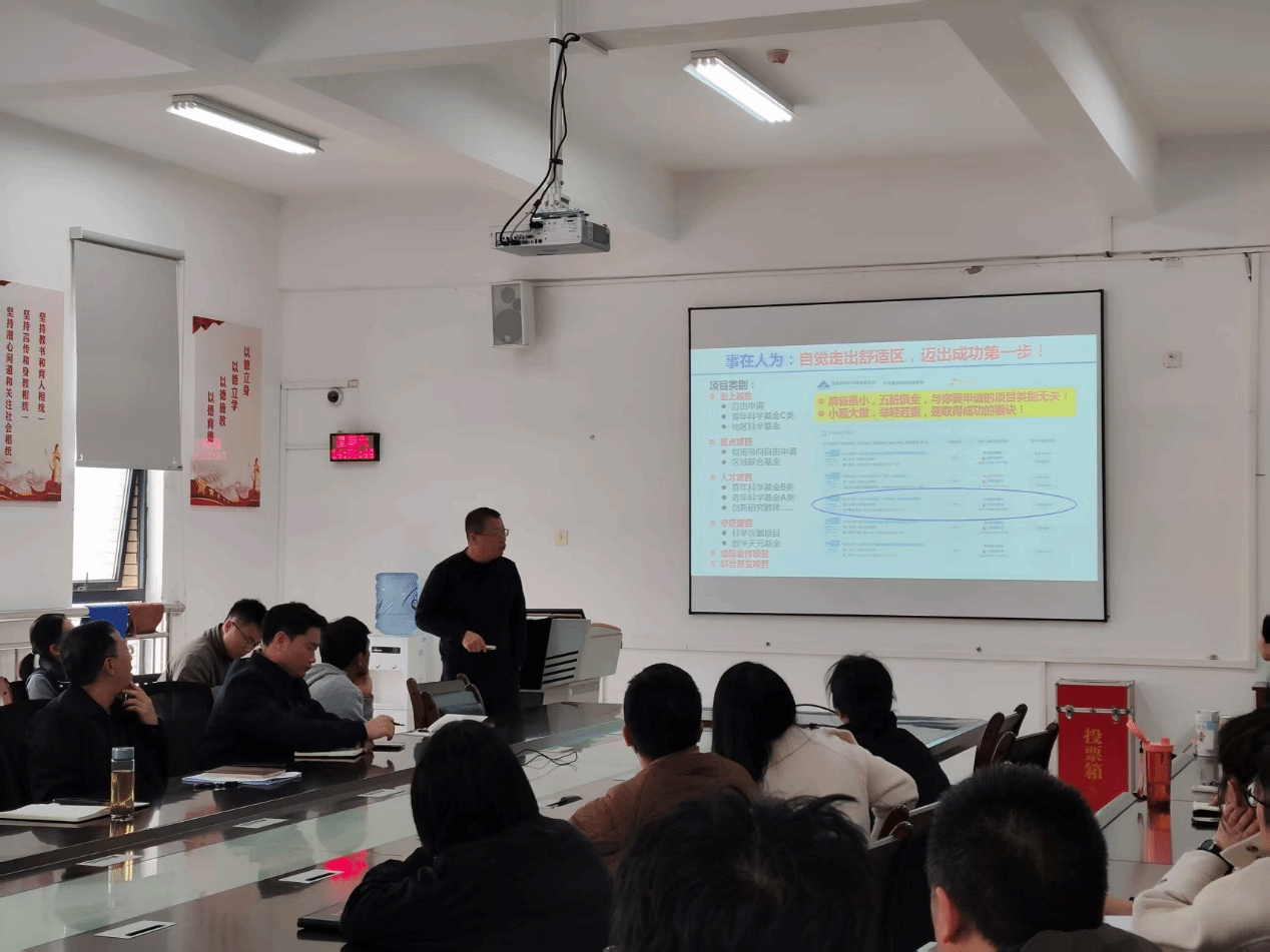 为扎实推进2026年国家自然科学基金申报工作,切实提升基金项目申报数量和质量,提高基金资助率,10月24日下午,学院在四楼会议室召开了 “2026年国家自然科学基金申报动员暨基金申报经验交流会”。学院全体教师参会,会议由党委书记胡长刚主持。